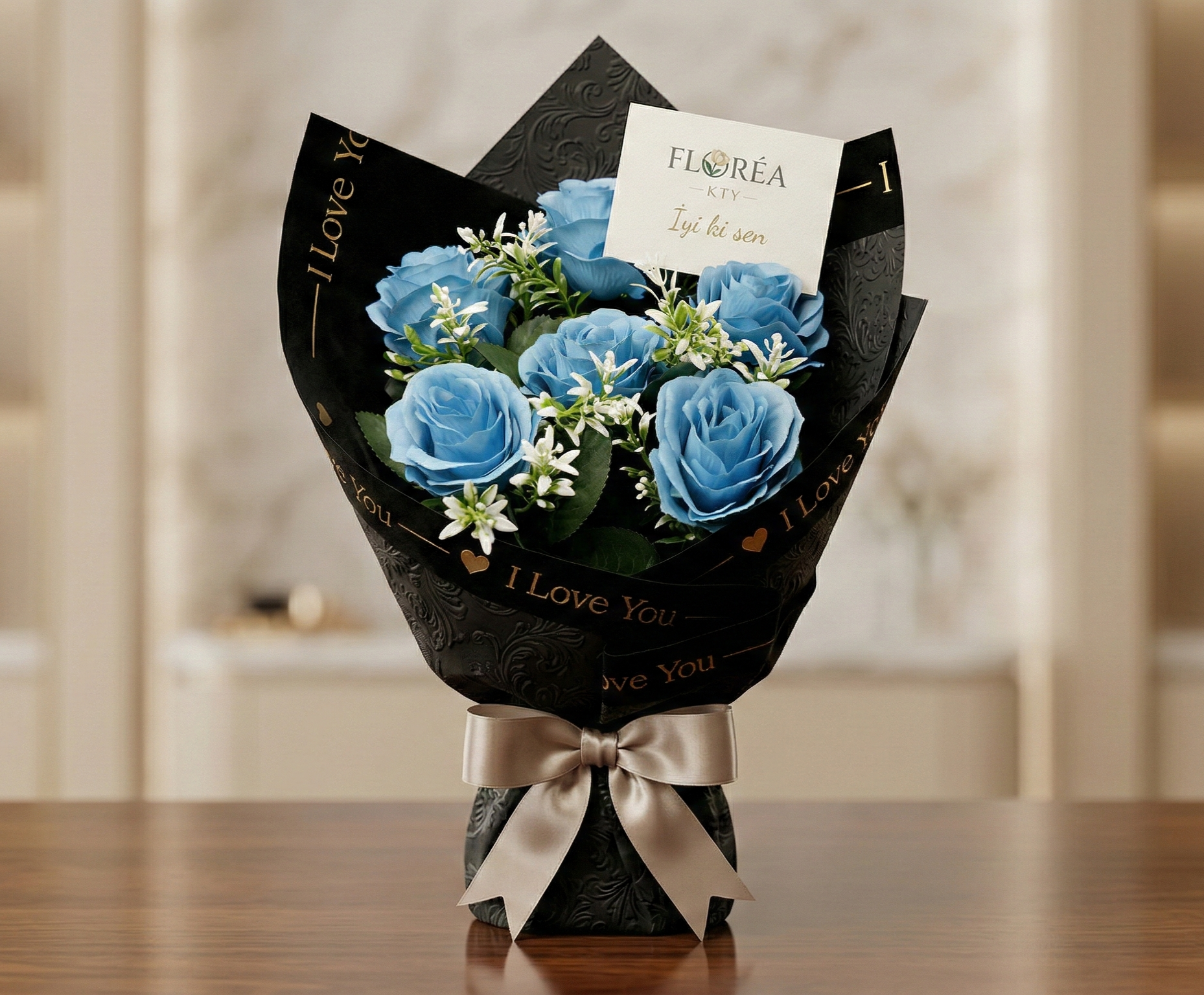 Mavi İmza, derin mavi gülleri ve lüks siyah ambalajıyla güçlü ve sofistike bir hediye sunar.
